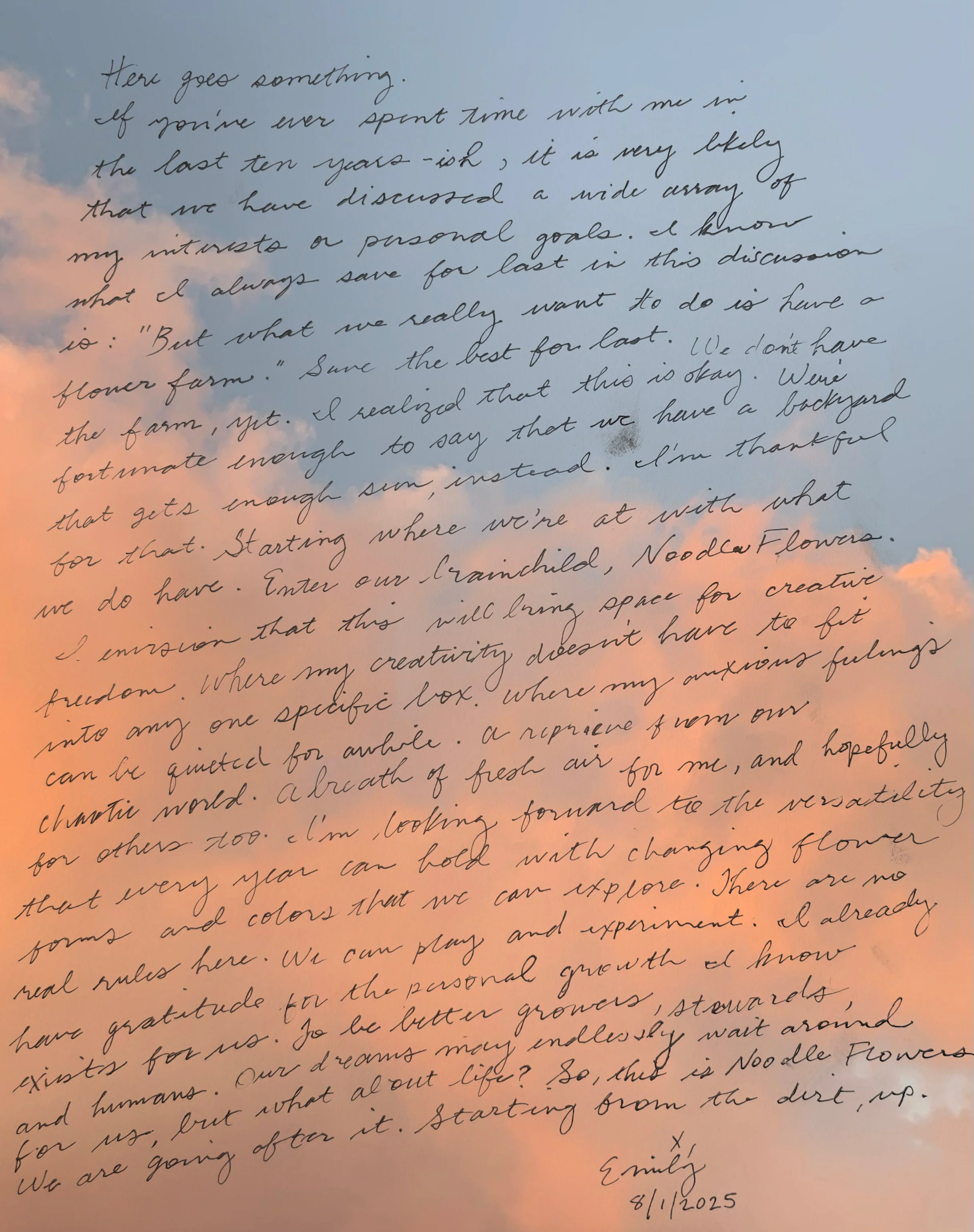 If you’ve ever spent time with me in the last ten years-ish, it is very likely that we have discussed a wide array of my interests or personal goals. I know what I always save for last in this discussion is: “But what we really want to do is have a flower farm”. Save the best for last. We don’t have the farm, yet. I realized that this is okay. We’re fortunate enough to say that we have a backyard that gets enough sun, instead. I’m thankful for that. Starting where we’re at with what we do have. Enter our brainchild, Noodle Flowers. I envision that this will bring space for creative freedom. Where my creativity doesn’t have to fit into any one specific box. Where my anxious feelings can be quieted for awhile. A reprieve from our chaotic world. A breath of fresh air for me, and hopefully for others, too. I’m looking forward to the versatility that every year can hold with changing flower forms and colors that we can explore. There are no real rules here. We can play and experiment. I already have gratitude for the personal growth I know exists for us. To be better growers, stewards, and humans. Our dreams may endlessly wait around for us, but what about life? So, this is Noodle Flowers. We are going after it. Starting from the dirt, up.